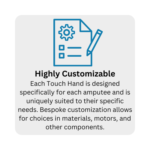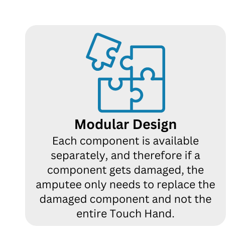 Touch Prosthetics seeks to propel the prosthetics field forward and make its technology more accessible to the general public. This will be achieved by producing low-cost, modular, advanced prosthetics with the aid of advanced 3D printing. Touch Hands allows for simple and easy operations using advanced control features. Our modular design will ensure that repairing the touch hand is simple and affordable to repair.